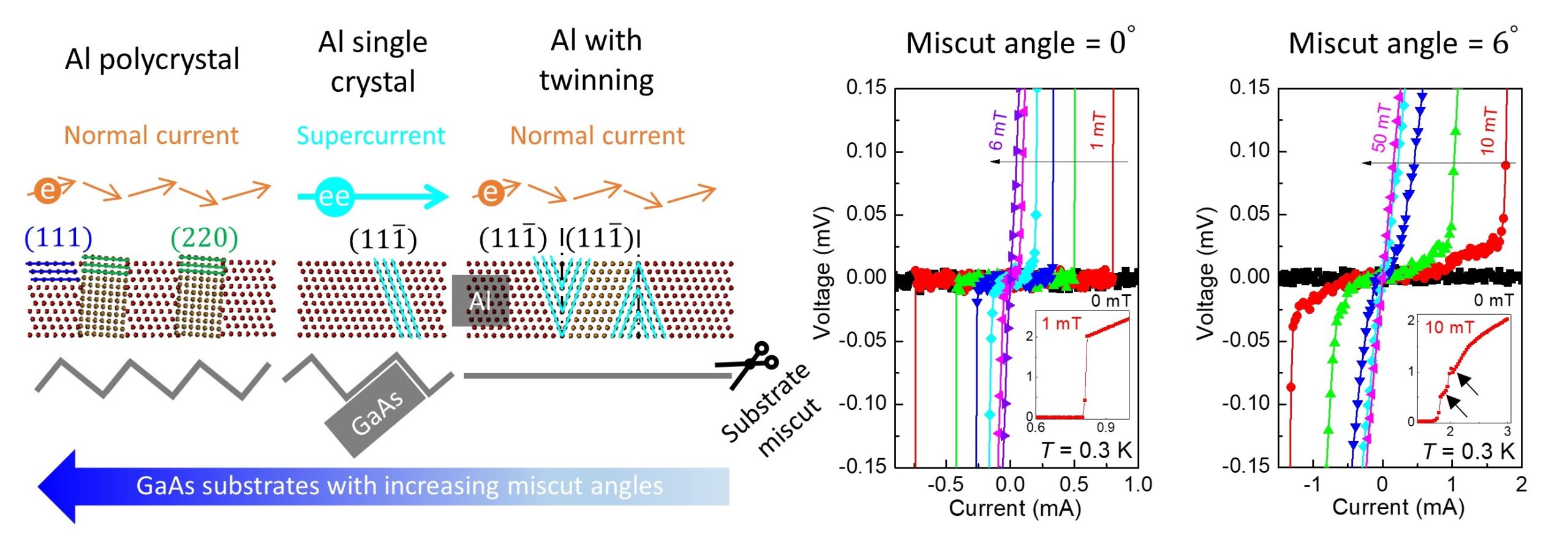 Aluminum (Al) has attracted considerable attention for uses in photonic, electronic, and quantum devices. Its grain architecture governs surface roughness, electron and light scattering, and quantum decoherence, all of which critically affect device performance. Enhancing crystalline domain size and refining granularity control remain an ongoing research focus for producing ultraclean nanofilms. This study investigates the crystallinity of epitaxial Al grown on miscut GaAs substrates and examines its influence on Al superconductivity. The introduction of a substrate miscut alters Al growth kinetics, enabling the formation of twinned grains, polycrystalline structures, and micrometer-scale single crystal. Variations in grain architecture result in significant modulation of the superconducting critical temperature, current, and magnetic field, respectively, while maintaining constant channel geometries. Reducing macroscopic grain boundaries decreases the Al nanofilm resistivity but enhances strain-induced crystallinity deterioration, driving a transition from type-I to type-II-like superconducting behavior. We suggest that preparing Al nanofilms, which approach an ultraclean limit in terms of surface quality, crystallinity, and transport properties, requires careful control of substrate miscut as well as the grain architecture. These findings highlight a tunable approach to controlling Al granularity and superconductivity via miscut, lattice-mismatched substrates.